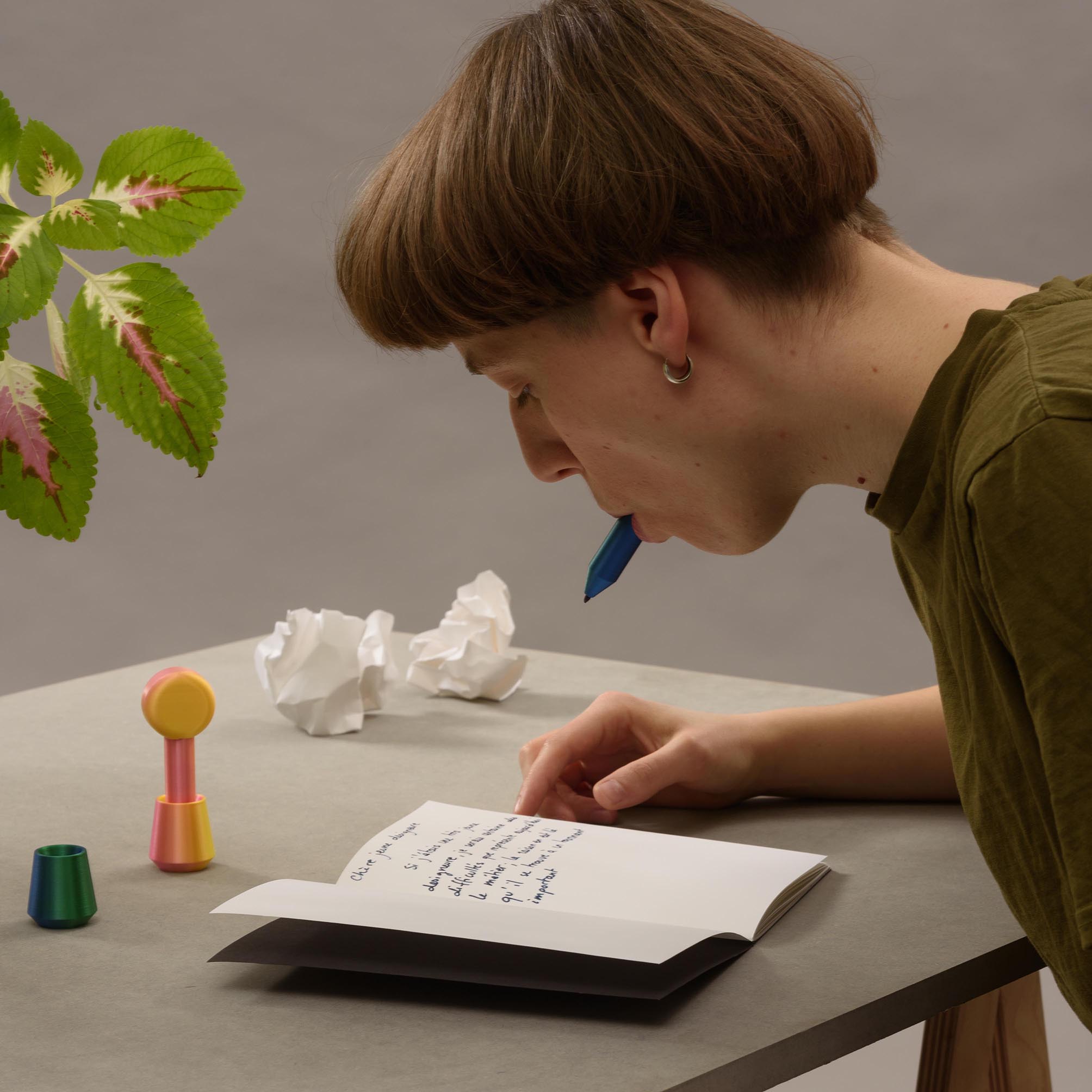 “De l’autre côté… ?” est une tentative de réconciliation des opposés par leur mise en dialogue, c’est une invitation en deux volets à renouveler notre lecture du réel. Le premier est la création d’objets chimériques, fantasques nés de la concaténation de deux choses qui n’auraient, à priori, rien à voir ensemble. Le deuxième est un système de composition de principes essentiels d’opposition. Les objets issus de cette recherche sont des outils de sensibilisation, ayant vocation à produire de la richesse dans le rapport au réel. Ce sont des essais de dépassement des oppositions binaires, ayant pour ambition de montrer qu’au-delà de ce qui sépare, de nouveaux possibles peuvent émerger.