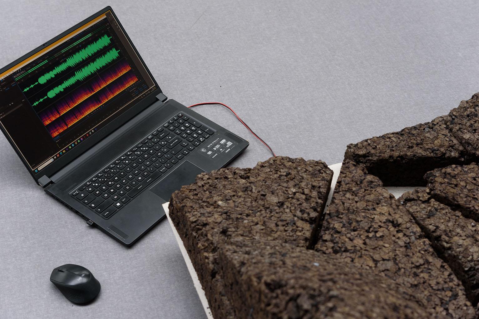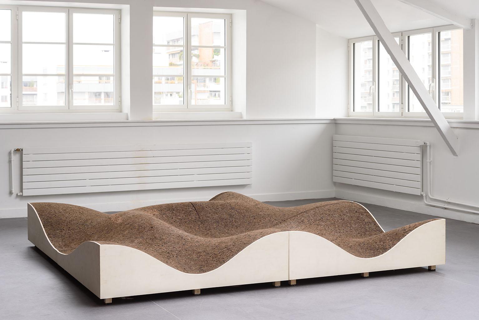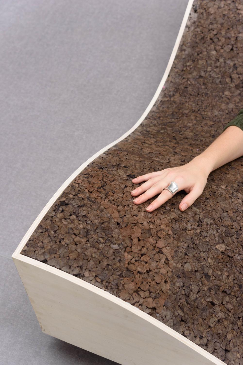 Centrée sur l'immersion sonore, cette installation propose une expérience sensorielle unique destinée à induire un état de relaxation par la perception haptique du son. Chaque module, soutenu par une structure en bois, diffuse des vibrations à partir d’un son par le biais de transducteurs. Le liège, matériau principal de l’installation, diffuse les vibrations tout en réduisant le bruit, offrant ainsi une expérience chaleureuse et apaisante. Chaque pièce a été conçue avec une forme organique spécifique, et c'est grâce à l'utilisation de l'usinage numérique que ces formes ont été obtenues avec précision. Cette approche permet non seulement une intégration harmonieuse dans différents espaces, mais aussi une variété de positions allongées. Ce dispositif invite les visiteur.euses à se laisser porter par les vibrations du son pour trouver un moment de calme intérieur.