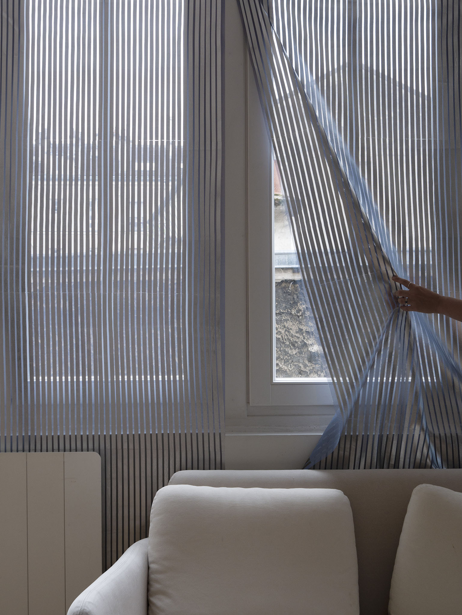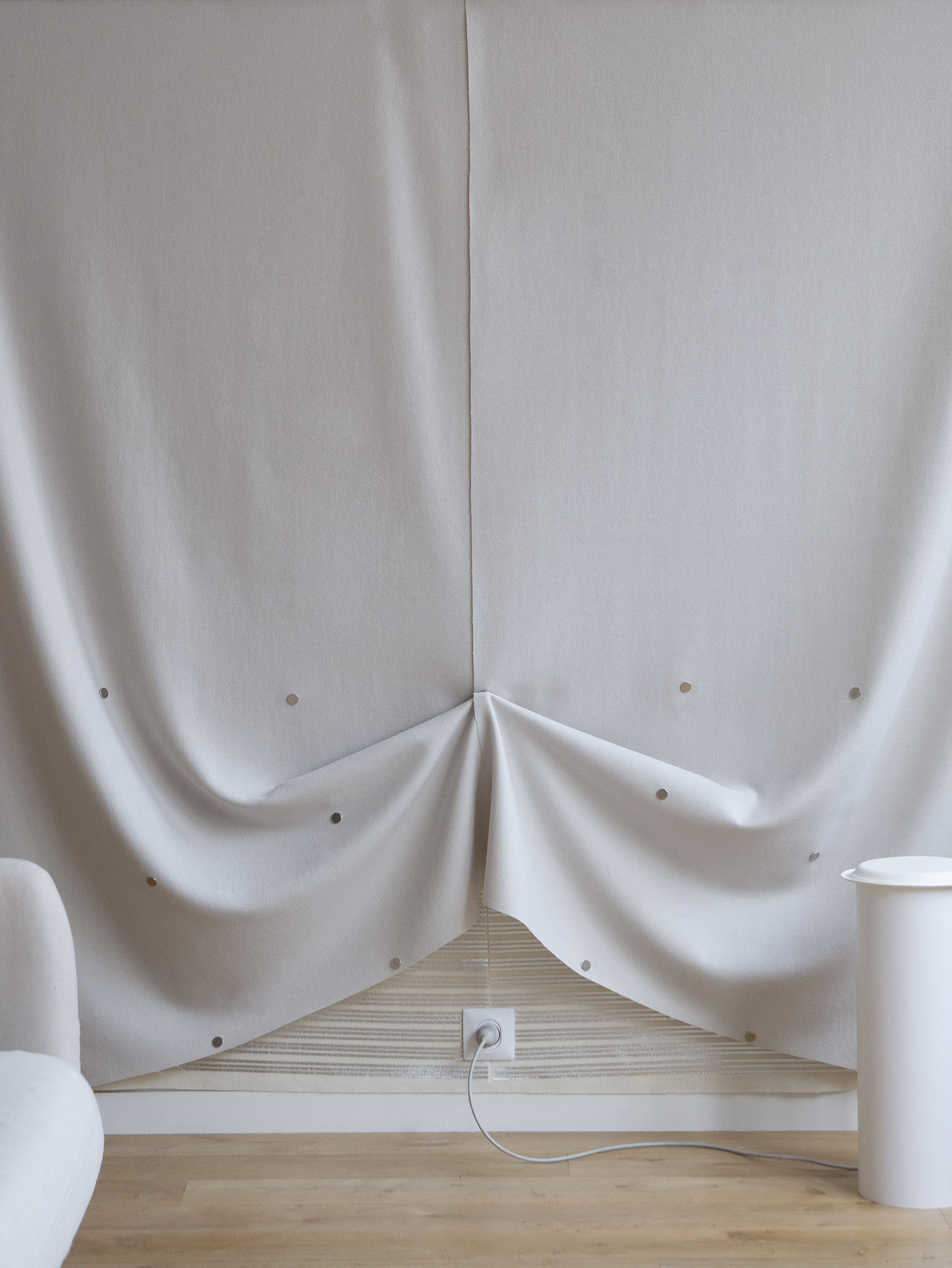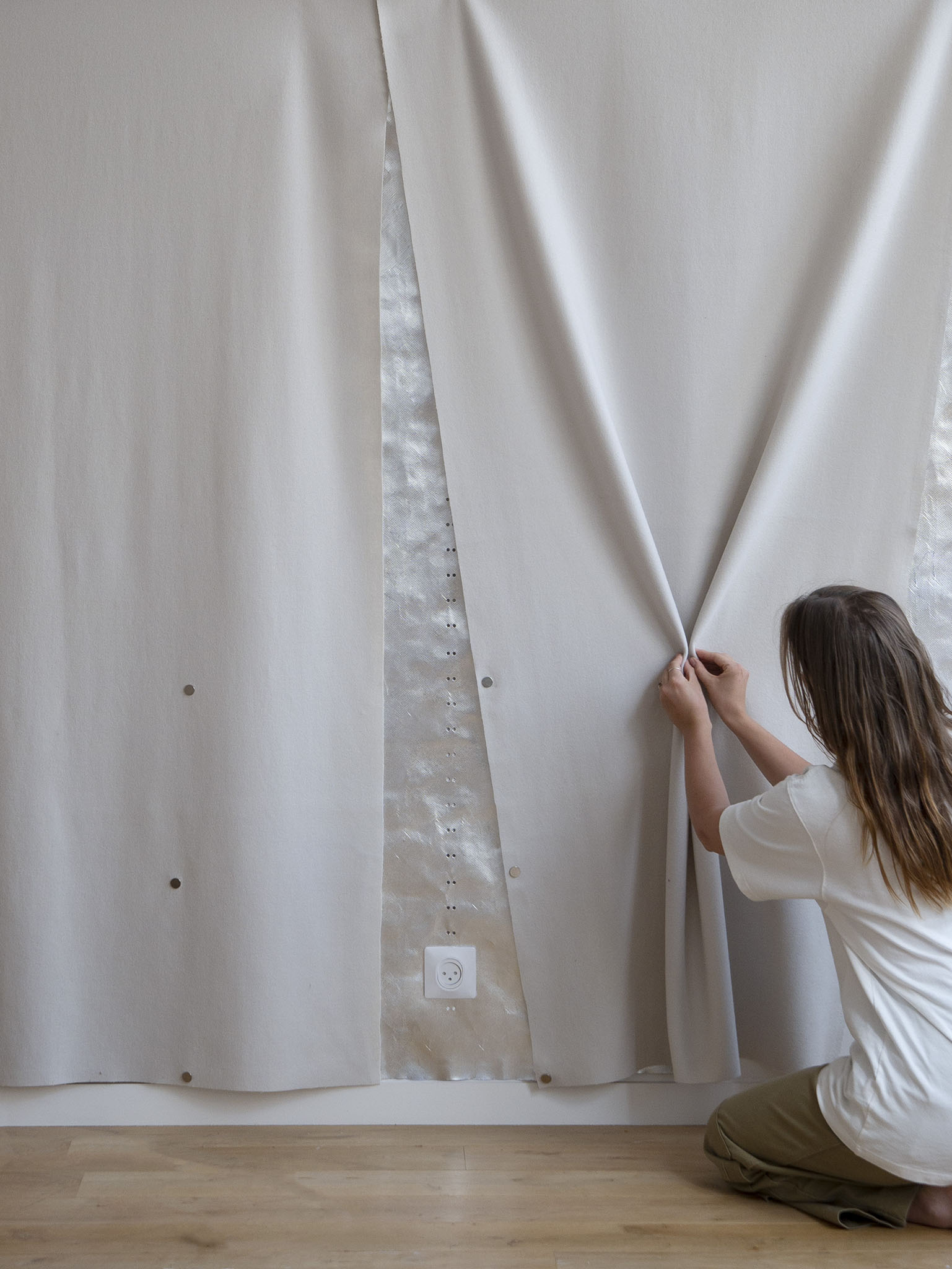 Dans un contexte où la rénovation thermique est devenue un impératif pour réduire la consommation énergétique d’un bâtiment, ce projet ouvre la voie à une nouvelle manière de concevoir l’isolation, sans qu’elle nécessite une intervention lourde sur le bâtiment ou une perte d’espace au sol. Le “IR system” est un système d’isolation mince et évolutif qui vient se greffer sur les murs et fenêtres des logements haussmanniens, et qui permet par l’accumulation de couches textiles d’adapter l’isolation du logement en fonction des saisons, des besoins du bâtiment. Son fonctionnement tire parti des qualités thermiques des produits minces réfléchissants (PMR) qui sont ici appliqués par motifs sur des rouleaux de laine isolante, ils sont requalifiés en un ensemble de tapisseries techniques, visibles et manipulables dans l’espace domestique.
