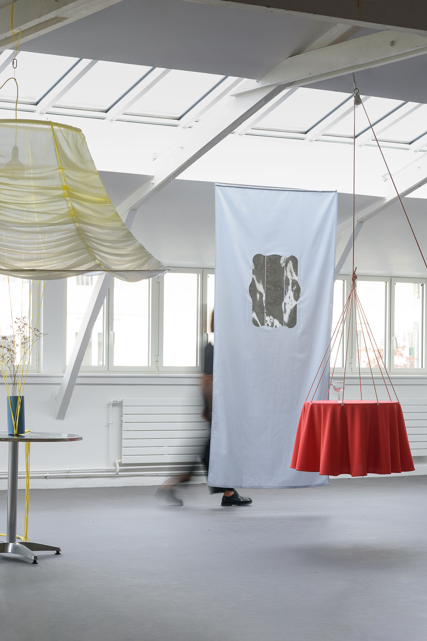 Dans notre habitat, l’archétype du mobilier est souvent associé à un état dur tandis que le textile est toujours complémentaire d’une structure, utilisé en tant que revêtement de confort ou comme surface décorative. Pourquoi ne pas imaginer un monde où les objets s’assouplissent dans lequel le textile est envisagé autrement ? Quatre objets ancrés dans l’univers domestique proposent une appréhension différente, de l’espace, du mobilier et de la manière dont on s’en empare, allant vers des usages moins conventionnels. Ils prennent vie dans une mise en scène avec une narration décalée proche de l’absurde.