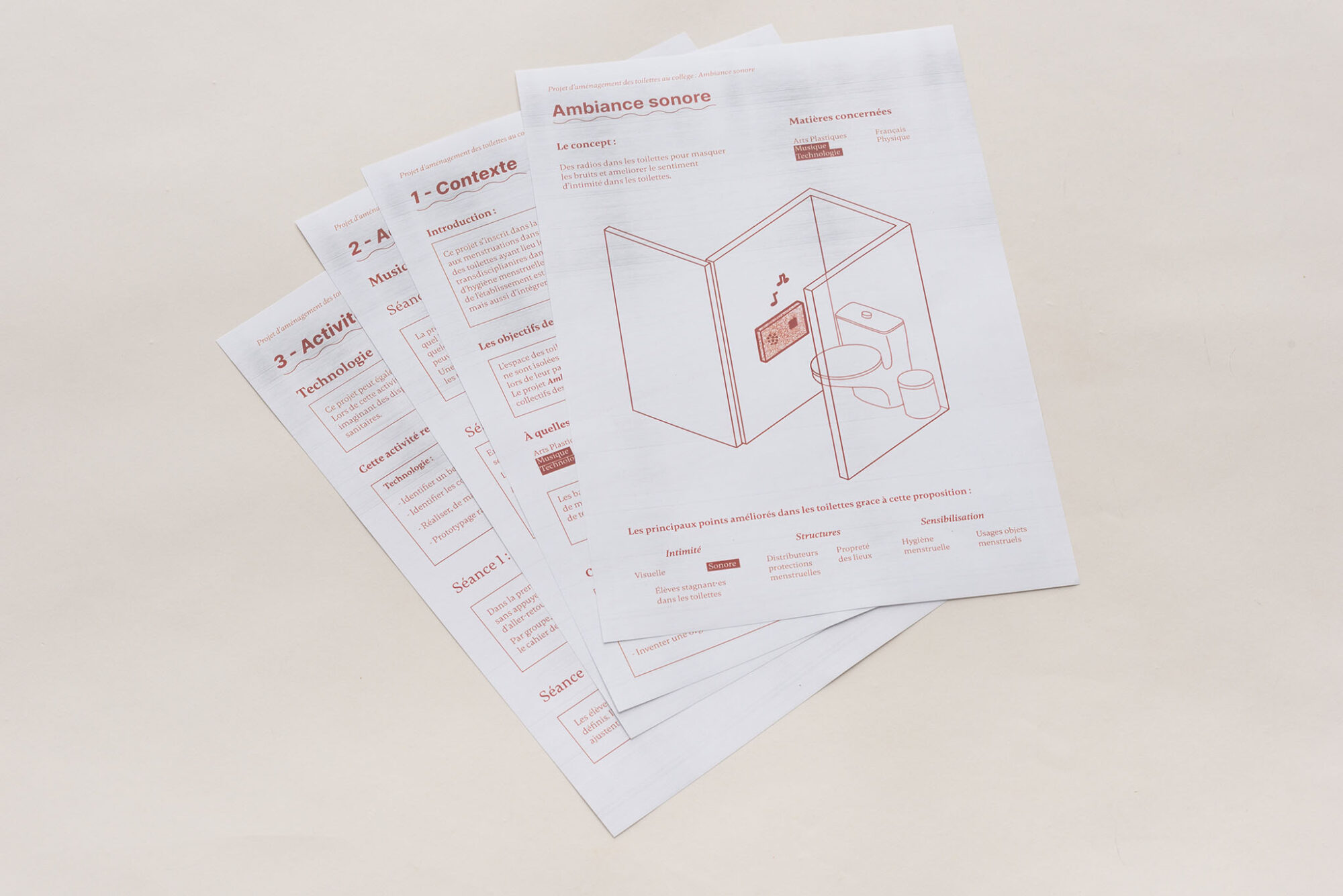 En 2023, 80% des élèves réglé·es estiment que les règles sont un facteur de stress à l’école. Le projet “Règlement intérieur” propose un ensemble d’outils pédagogiques adaptables, à destination des collèges pour parler des menstruations. Grâce à des formes ludiques, un graphisme évocateur et un ton décomplexé, il est possible d’aborder ce sujet tabou de façon directe et collaborative. Les élèves prennent alors part à la conception d’un environnement de travail plus égalitaire et bienveillant.