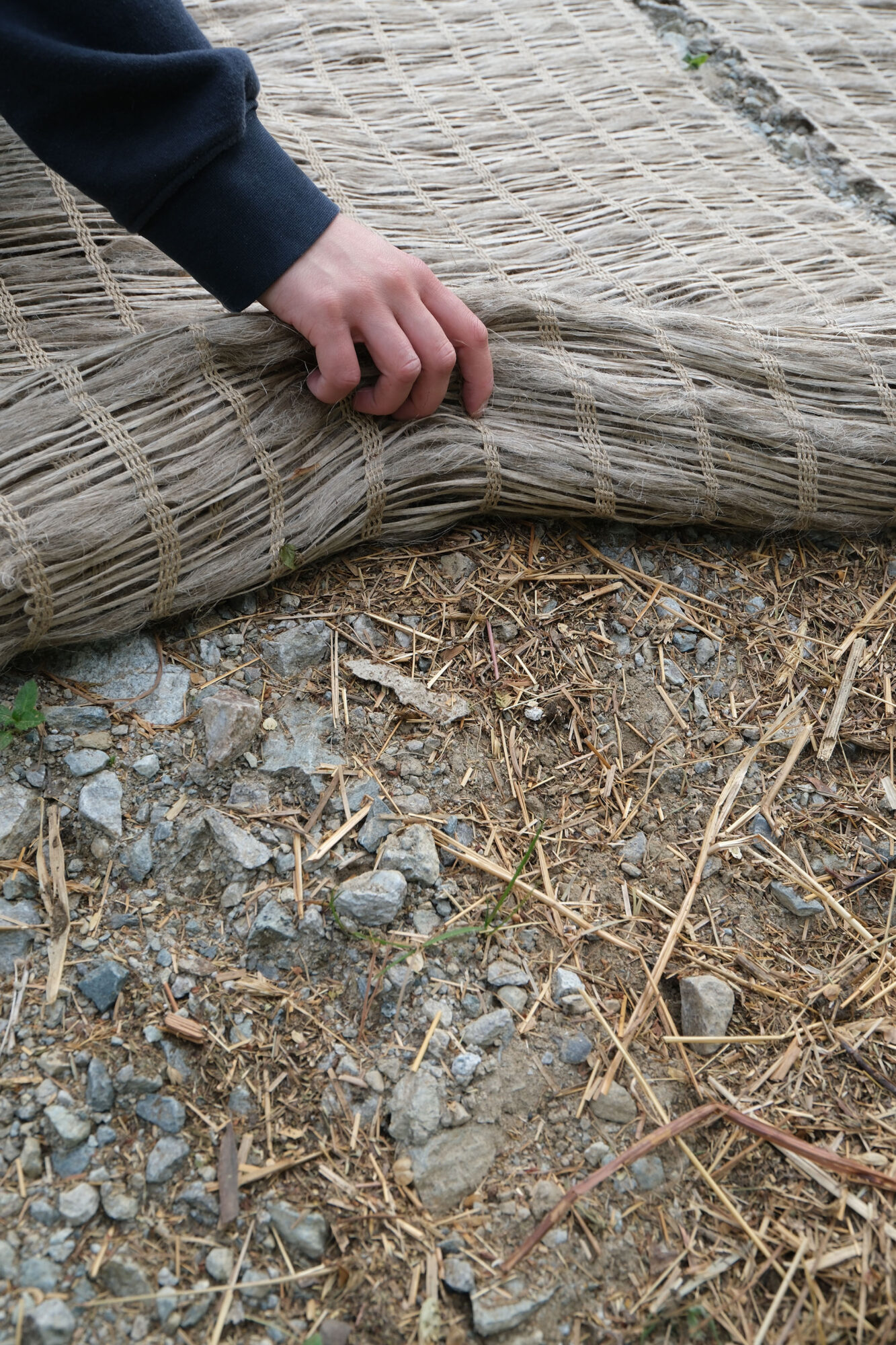 Ce projet est une proposition d’aide au processus de régénération des pistes de ski, fragilisées par les diverses pressions qu’elles subissent. Trois catégories de géotextiles ont été tissées sous lesquelles sont placées des graines locales et des mycorhizes. La technique de la gaze permet de créer des textiles ajourés qui ne sont pas moins d’une grande solidité. L’utilisation d’un lin de moindre qualité permet de trouver un débouché à ces fibres peu valorisées. Pensé comme un écosystème, l’objet est conçu en tenant compte de son inscription dans le territoire, des différentes temporalités et des acteur·rices (alpagistes, employé.es de la station, touristes).